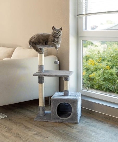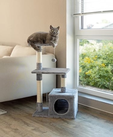 Diseño Ergonómico y Funcional: El árbol rascador Lionto cuenta con un diseño que incorpora plataformas, cuevas y postes rascadores, proporcionando a los gatos múltiples opciones para jugar, descansar y afilar sus garras. Esto fomenta el enriquecimiento y el ejercicio diario de las mascotas.